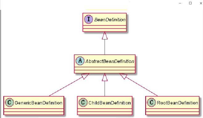 Spring通过BeanDefinition将配置文件中的配置信息转换为容器的内部表示,并将这些BeanDefinition注册到BeanDefinitionRegistry中。Spring容器的BeanDefinitionRegistry就像是Spring配置信息的内存数据库,主要是以map的形式保存,后续操作直接从BeanDefinitionResistry中读取配置信息。它们之间的关系如下图所示: