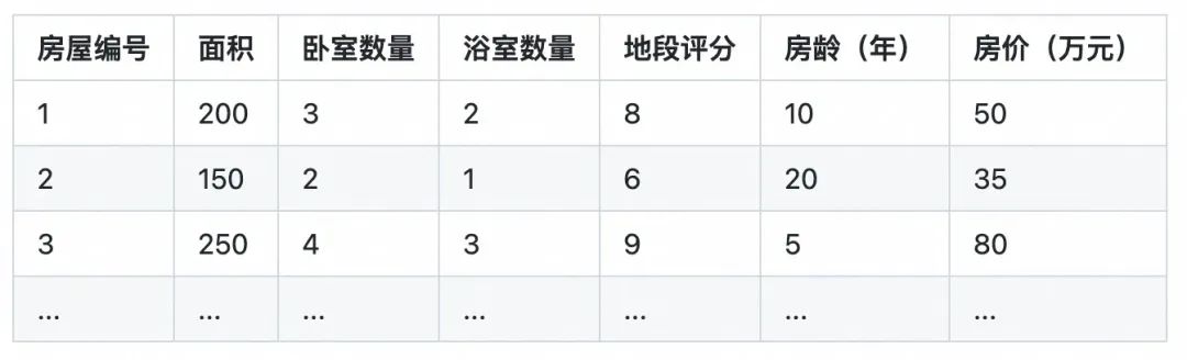 我们用一个例子来理解数据相关的几个核心概念,假设我们希望建立一个机器学习模型,根据房屋的各种属性(如面积、位置、卧室数量等)来预测房价。