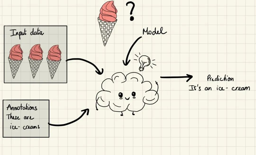 两张好玩的图片帮大家理解监督学习与无监督学习,不断给婴儿看各种各样冰激凌的图片,让其分辨下一张是不是冰激凌,这是监督学习
