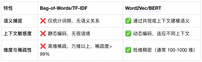 有非常多将 Token 转为数值向量的方法,最常见的有 Bag-of-Words、TF-IDF、One-Hot Encoding 等。这类传统方法如短文本分类等简单场景中仍具实用性,但其语义缺失、稀疏性、静态表示的核心缺陷限制了在复杂任务的性能。