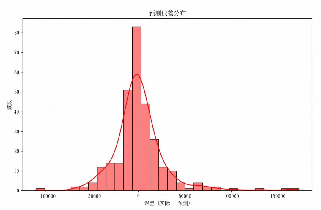 图中 RMSE 在 0 附近的频数最高,表明模型的大部分预测值与实际值较为接近,这是一个积极的信号,说明模型在多数情况下能够给出相对合理的预测。