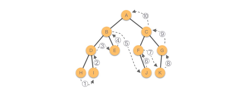 如下图所示,该二叉树的后序遍历顺序为:𝐻−𝐼−𝐷−𝐸−𝐵−𝐽−𝐹−𝐾−𝐺−𝐶−𝐴。