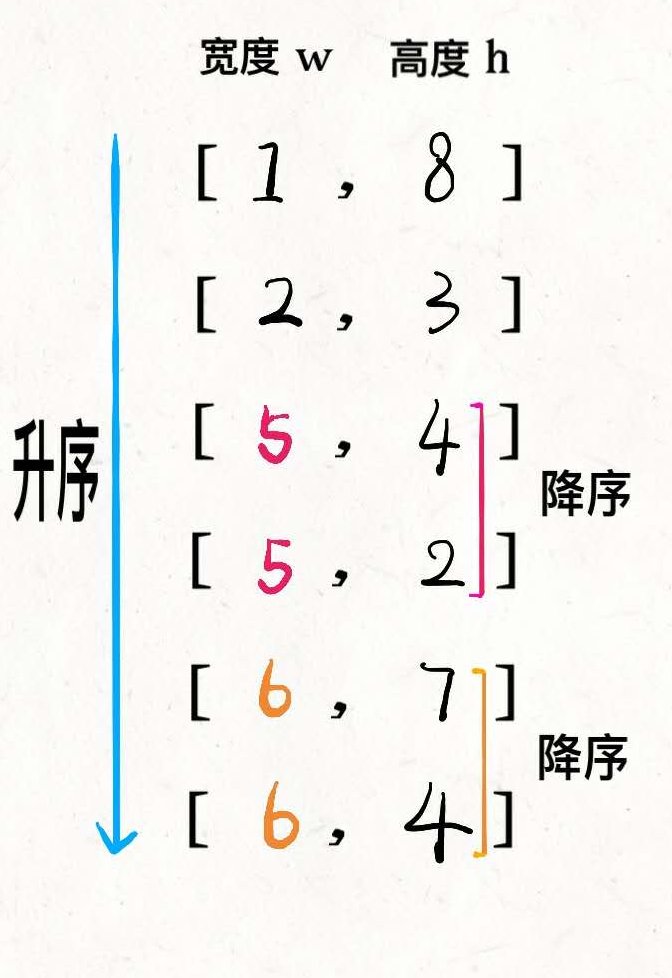 对于宽度 w 相同的数对,要对其高度 h 进行降序排序。因为两个宽度相同的信封不能相互包含的,逆序排序保证在 w 相同的数对中最多只选取一个。