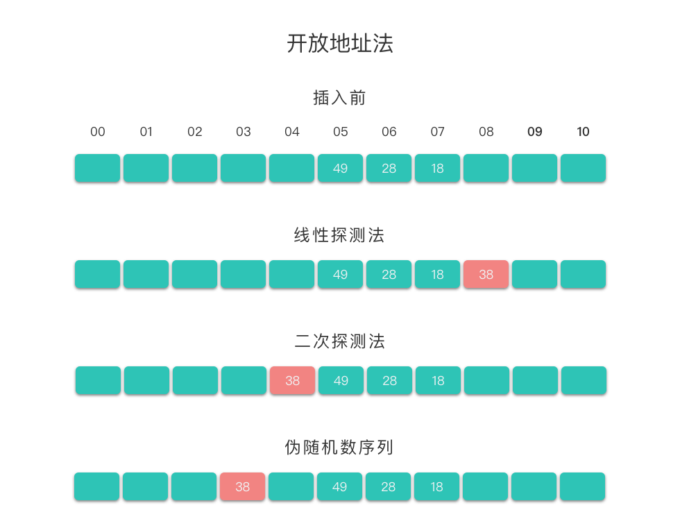 举个例子说说明一下如何用以上三种冲突解决方法处理冲突,并得到新地址 H(i)。例如,在长度为 11 的哈希表中已经填有关键字分别为 28、49、18 的记录(哈希函数为 Hash(key) = key % 11)。现在将插入关键字为 38 的新纪录。根据哈希函数得到的哈希地址为 5,产生冲突。接下来分别使用这三种冲突解决方法处理冲突。