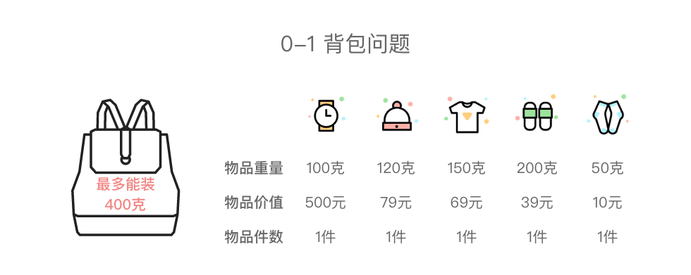 0-1 背包问题的特点:每种物品有且仅有 1 件,可以选择不放入背包,也可以选择放入背包。