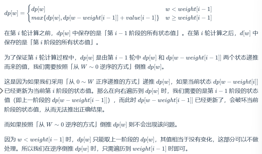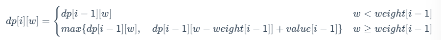 定义状态 dp[i] [w]表示为:前 i 件物品(此处不包括 i )放入一个最多能装重量为 w 的背包中,可以获得的最大价值。