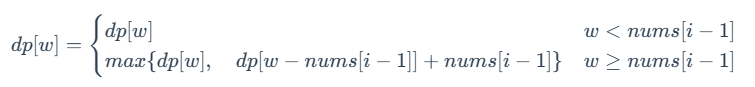 定义状态 dp[w]表示为:从数组 nums 中选择一些元素,放入最多能装元素和为 w 的背包中,得到的元素和最大为多少。