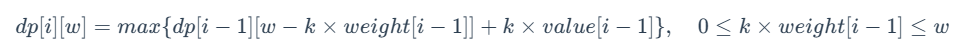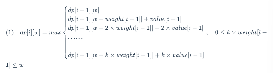 - 选择 k 件第 i−1 件物品:可以获得的最大价值为 dp[i−1] [w−k×weight[i−1]]+k×value[i−1]。
