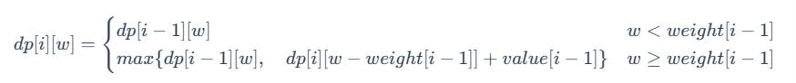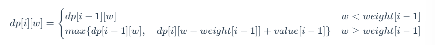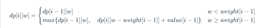 注意:式 (3) 的满足条件为 0≤weight[i−1]≤w。当 w<weight[i−1] 时,dp[i] [w]=dp[i−1] [w]。