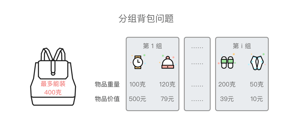 状态 dp[i] [w] 是一个二维数组,其中第一维代表「当前正在考虑的物品组数」,第二维表示「当前背包的载重上限」,二维数组值表示「可以获得的最大价值」。