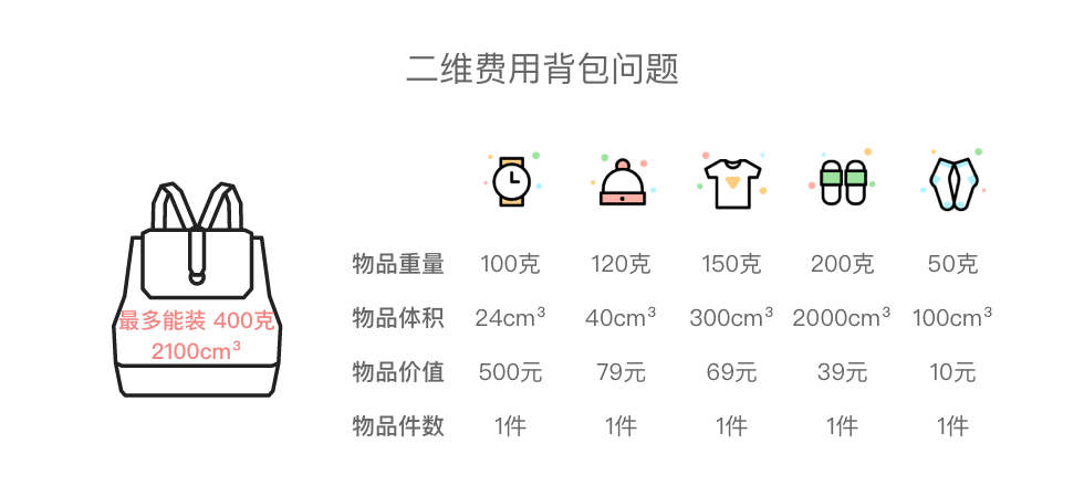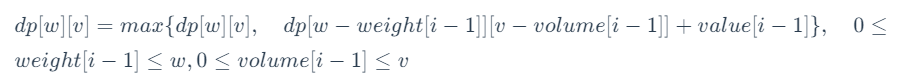 定义状态 dp[w] [v]表示为:将物品装入最多能装重量为 w、容量为 v 的背包中,可以获得的最大价值。
