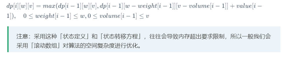 定义状态 dp[i] [w] [v] 为:前 i 件物品放入一个最多能装重量为 w、容量为 v 的背包中,可以获得的最大价值。