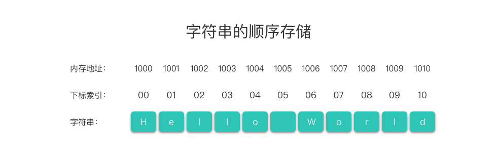 如上图所示,字符串的顺序存储中每一个字符元素都有自己的下标索引,下标所以从 0 开始,到 字符串长度 - 1 结束。字符串中每一个「下标索引」,都有一个与之对应的「字符元素」。