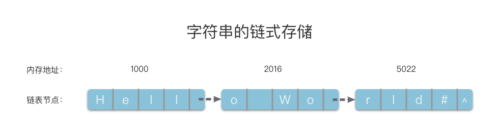 如上图所示,字符串的链式存储将一组任意的存储单元串联在一起。链节点之间的逻辑关系是通过指针来间接反映的。