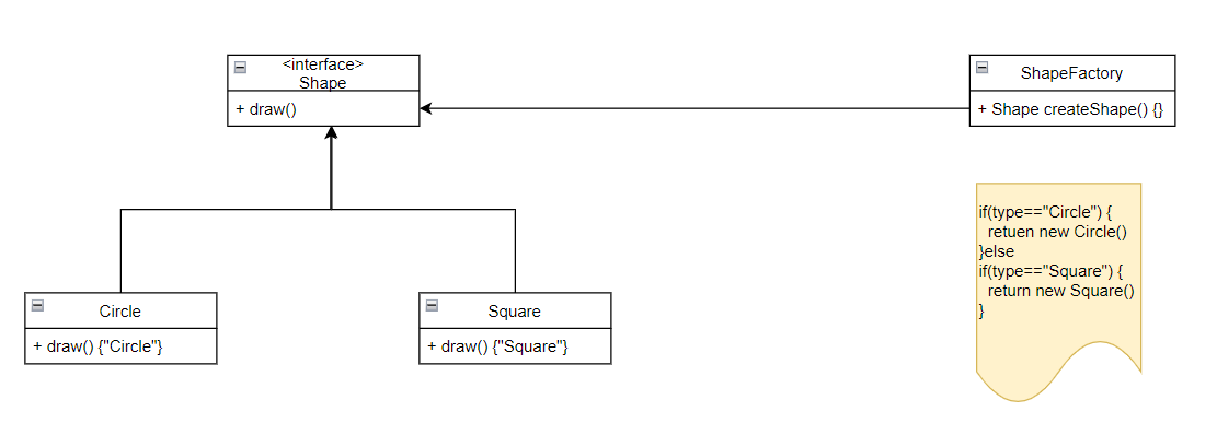 Circle类和Square类,具体产品通过简单工厂类的if-else逻辑来实例化。