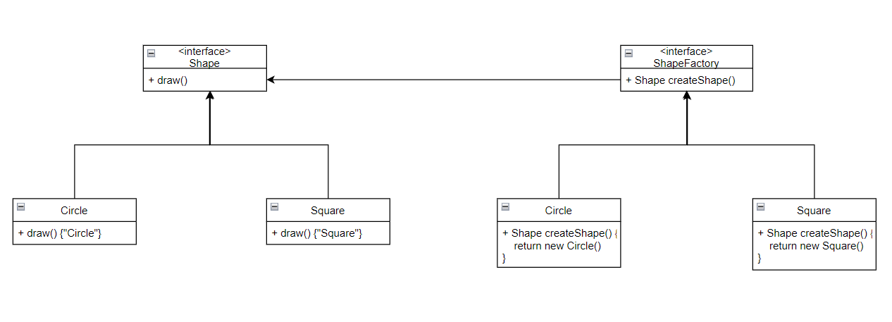 class SquareFactory implements ShapeFactory { @Override public Shape createShape() { return new Square(); } }