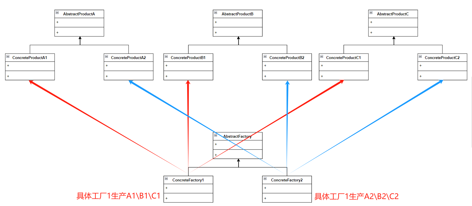在上面的图示中:AbstractProductA/B/C 就是抽象产品,ConcreteProductA1/A2/B1/B2/C1/C2就是抽象产品的实现,AbstractFactory定义了抽象工厂接口,接口里的方法用于创建具体的产品,而ConcreteFactory就是具体工厂类,可以创建一组相关的产品。
