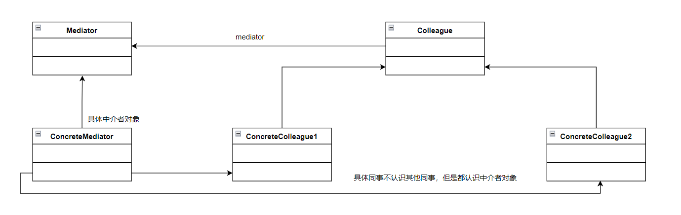 - 抽象同事类(Colleague): 定义同事类的接口,维护一个对中介者对象的引用,用于通信。