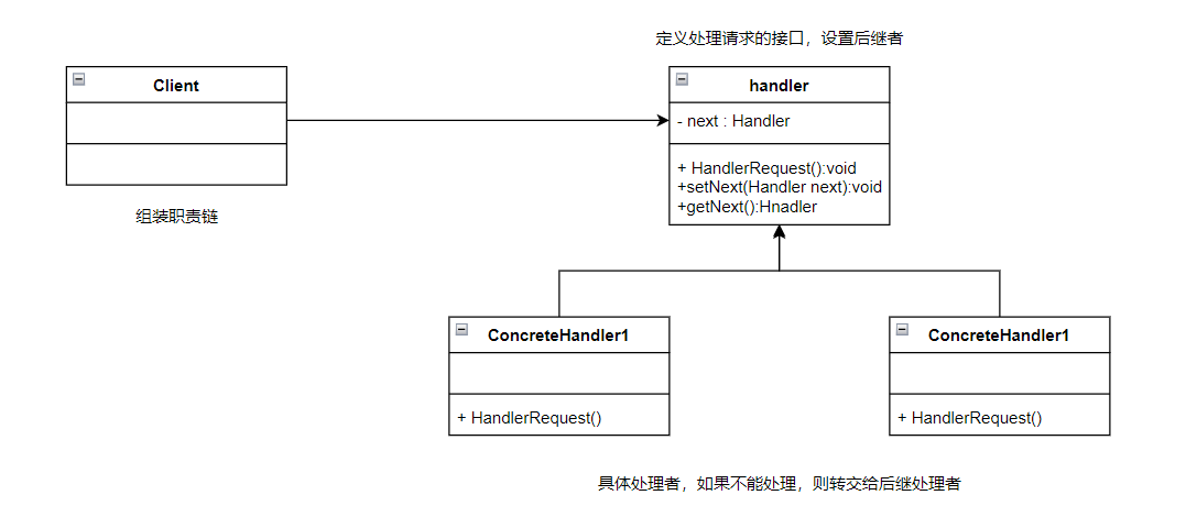 Handler :定义一个处理请求的接口,包含一个处理请求的抽象方法和一个指向下一个处理者的链接。