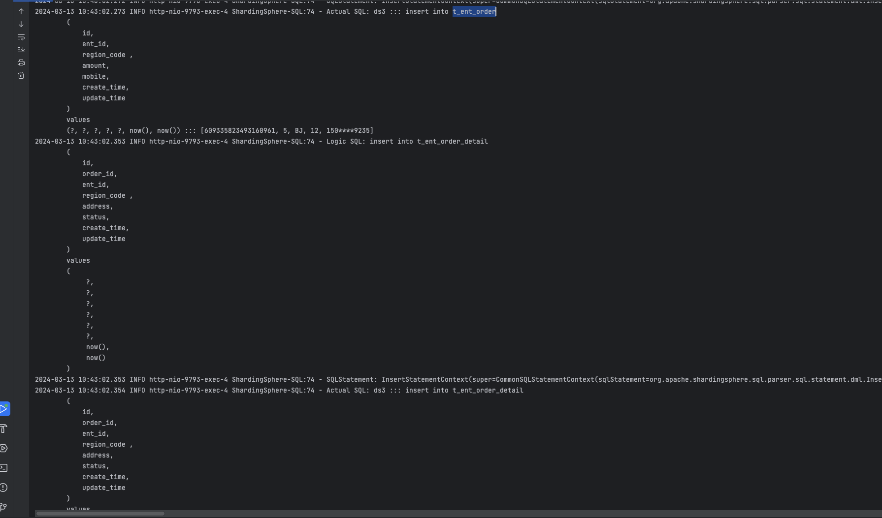 我们插入1 条订单记录、1 条订单详情表进入 ds3 分片,并且 2 条订单条目表进入 ds3 分片的 t_ent_order_item_7 表。