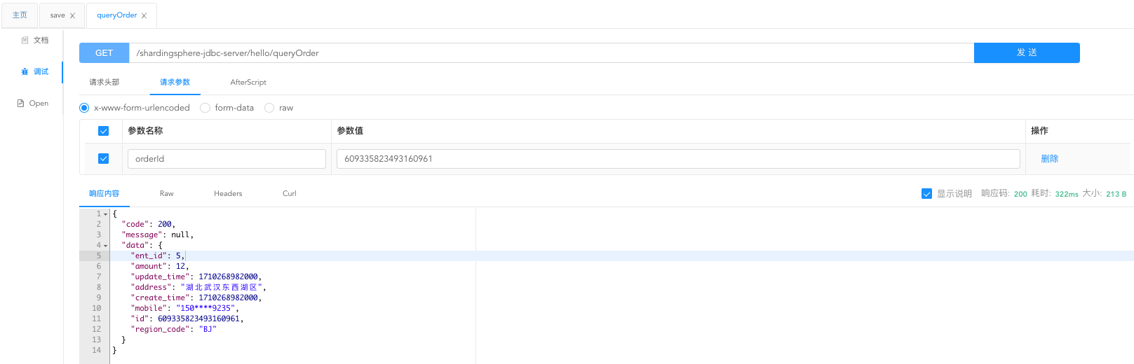 参数名称是 orderId , 参数值:609335823493160961 ,点击发送按钮,接口响应成功 , 返回订单信息。