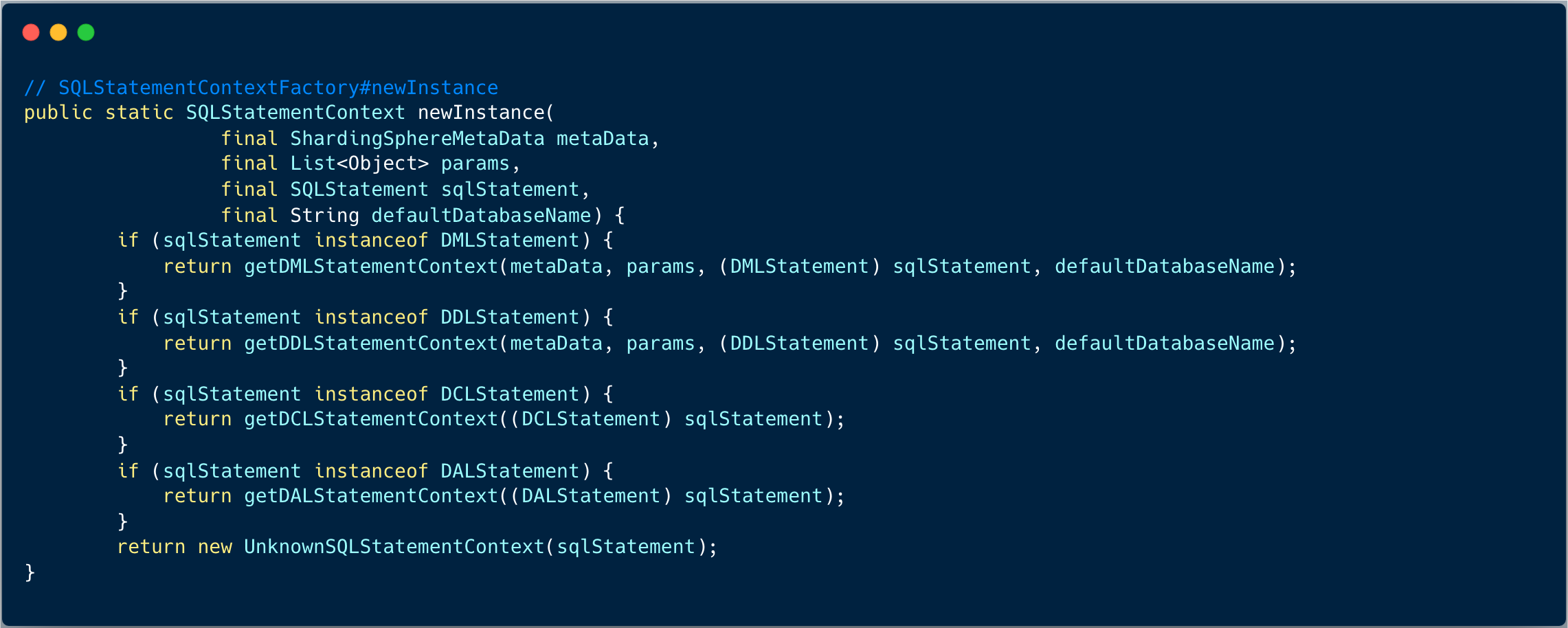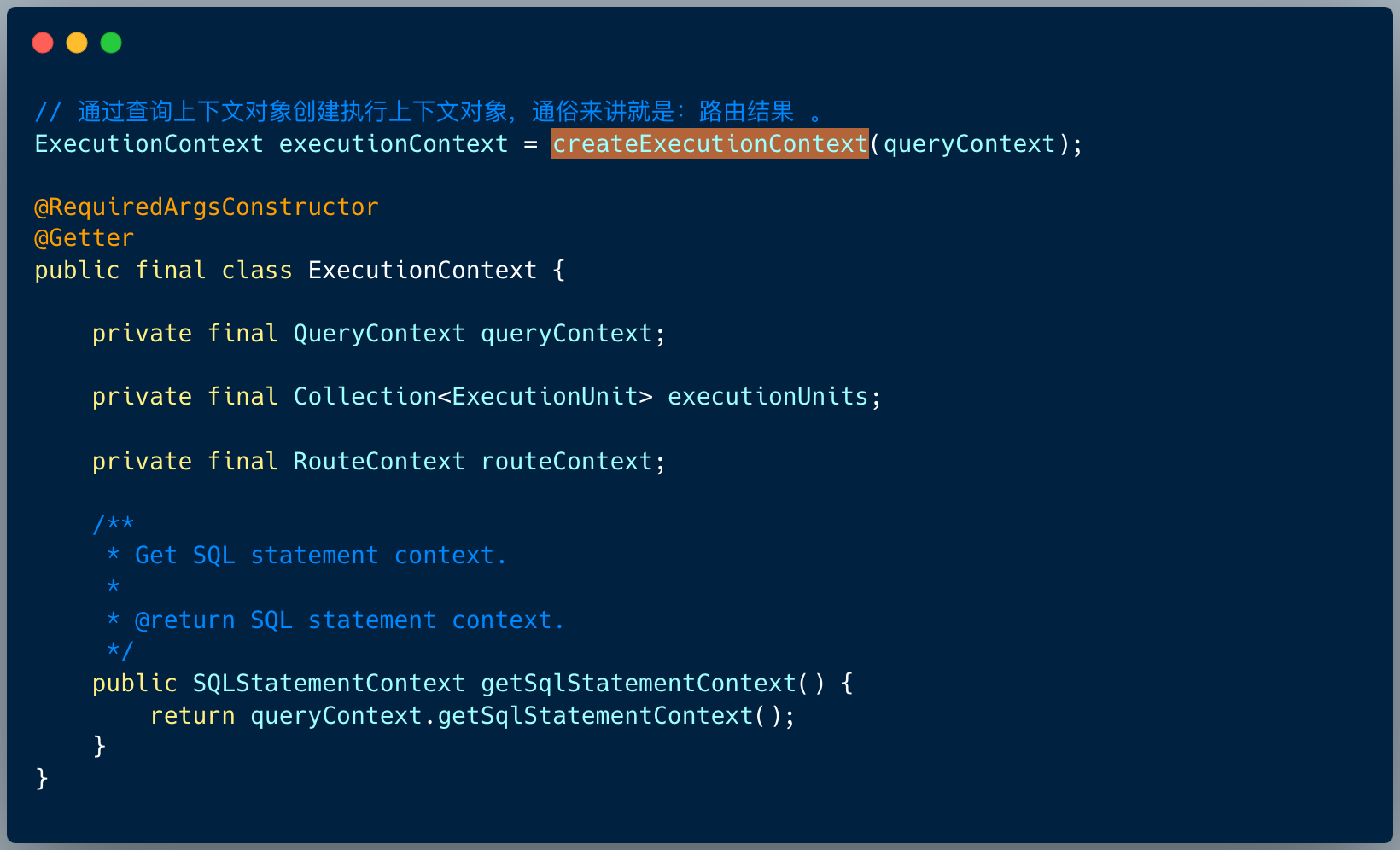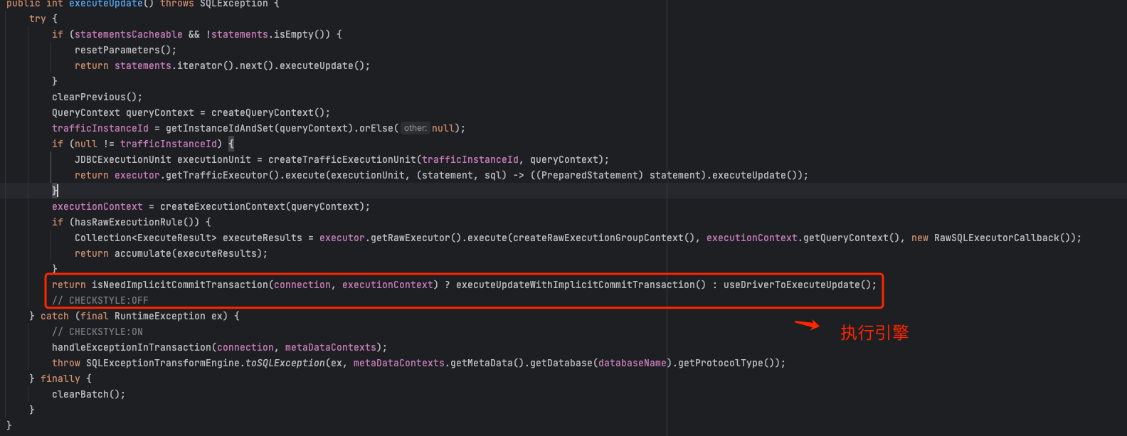 executeUpdate 方法的第一步是:创建查询上下文对象 QueryContext , 将 模型上下文 SQLStatementContext 、预编译参数对象包装起来。