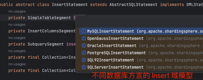 虽然我们生成了域模型,但 shardingsphere 生态的目的是满足 MySQL 、Oracle 、PostgreSQL 等分片需求 ,所以生成了 MySQLInsertStatement 之后,需要将域模型做一次转换。