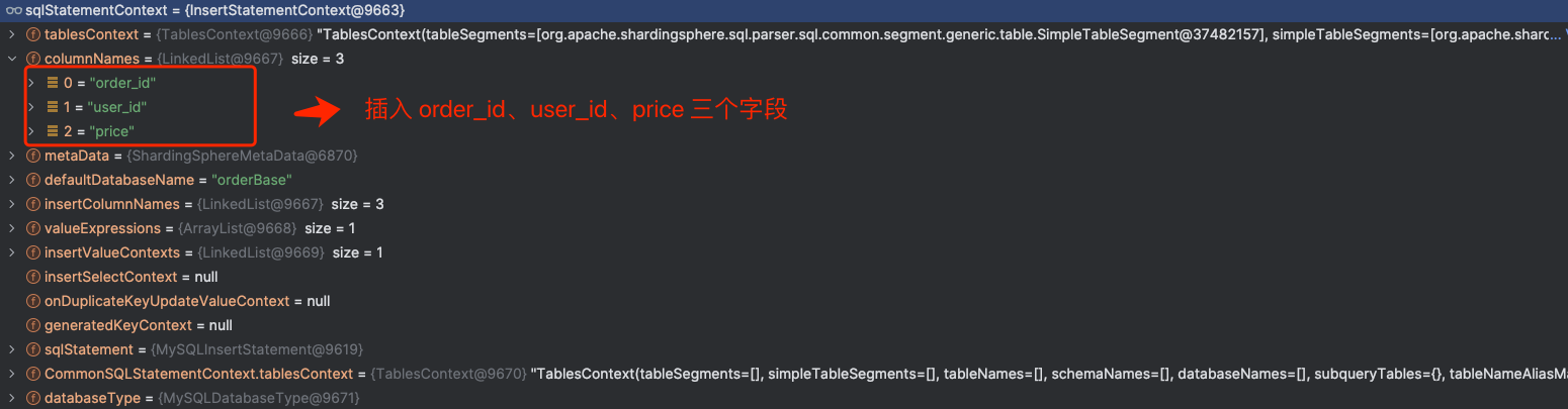 图中,ShardingSpherePreparedStatement 的构造函数内部完成了 SQL 解析 , 域对象是 MySQLInsertStatement 。