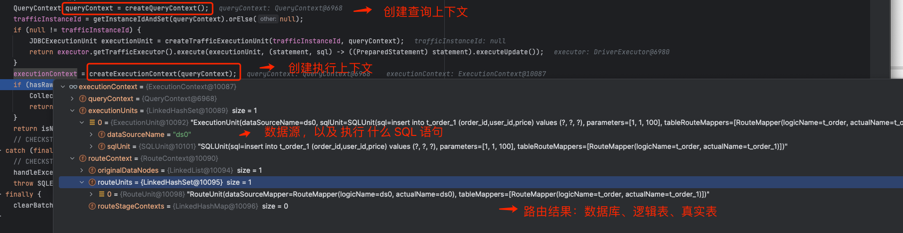 2、执行单元集合:路由到哪个数据分片、该分片执行的 真实 SQL 语句 。