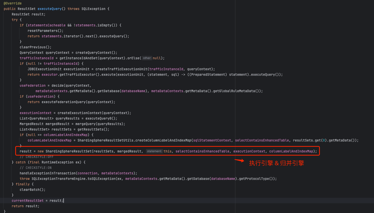 当我们得到执行上下文对象,分别调用执行引擎、归并引擎获取执行结果: