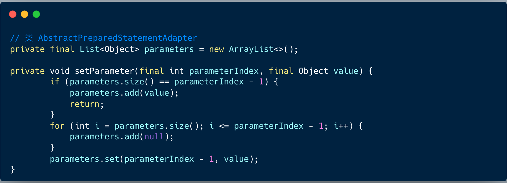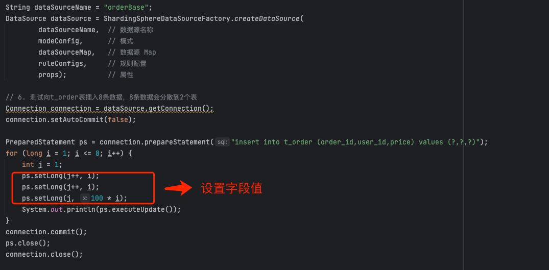 2、预编译赋值:ShardingSpherePreparedStatement 内部有一个 List 对象 parameters ,用于存储预编译的赋值。