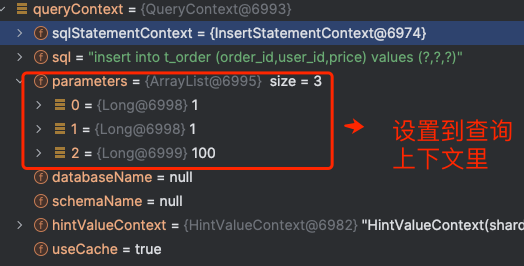 3、开始执行查询/修改操作, 创建查询上下文对象 QueryContext,将模型上下文 SQLStatementContext 、预编译参数对象包装起来起来。