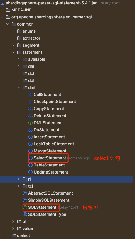 当我们有不同的 SQL 语句,根据类型不同,解析成如图 dml 包下不同的域模型 SQLStatement 。