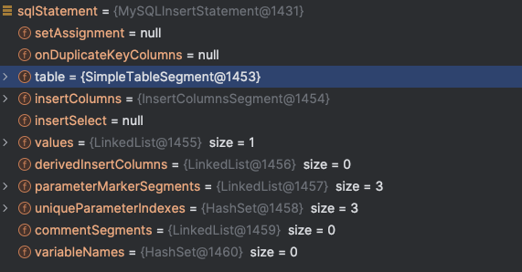 图中,ShardingSpherePreparedStatement 的构造函数内部完成了 SQL 解析 , 域对象是 MySQLInsertStatement 。