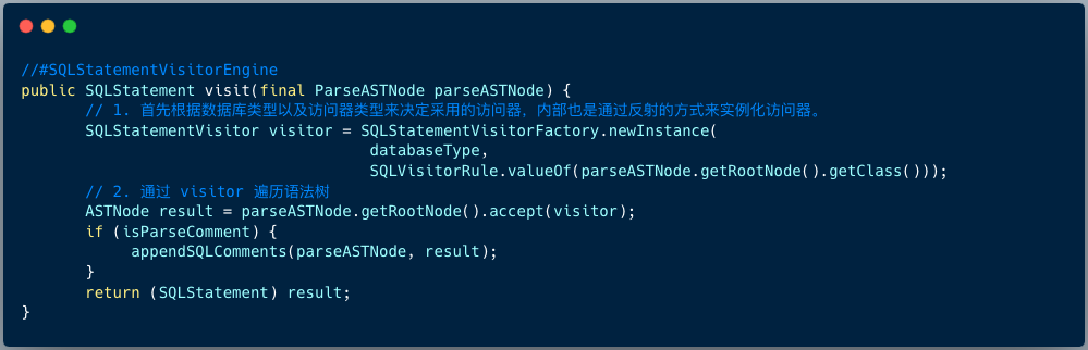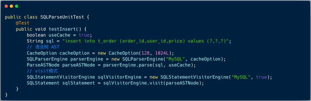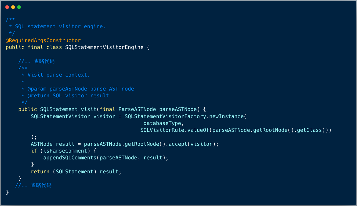 ShardingSphere 使用 ANTLR 作为 SQL 解析引擎的生成器,并采用 Visit 的方式从 AST 中获取域模型 SQLStatement。