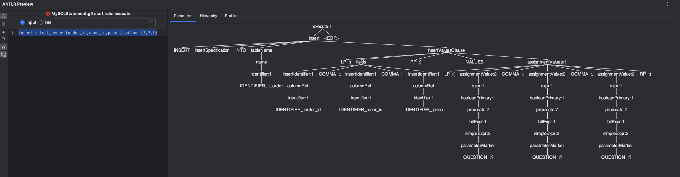 接下来,我们通过 IDEA ANTLR4 插件查看 SQL 生成的语法树。