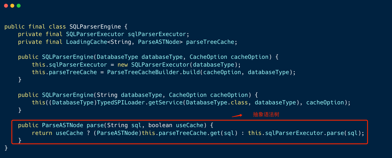 Apache ShardingSphere 的 SQLParserEngine 是对 ANTLR4 解析的封装和抽象,它会通过 SPI 的方式来加载数据库方言的解析器,用户可以通过 SPI 扩展点对数据方言进行进一步扩展。另外内部还增加了缓存机制,用来提高性能。