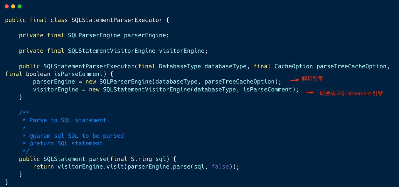 解析执行器内部创建了两个对象分别是:SQL 解析引擎和 SQL 访问引擎。