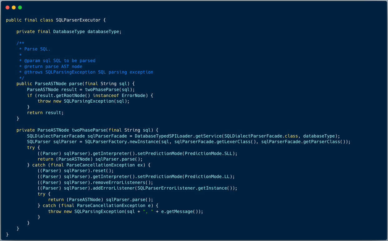 shardingsphere 提供独立的 SQL 解析功能、可以非常方便的对语法规则进行扩充和修改(使用了 ANTLR),同时支持多种方言的 SQL 解析。