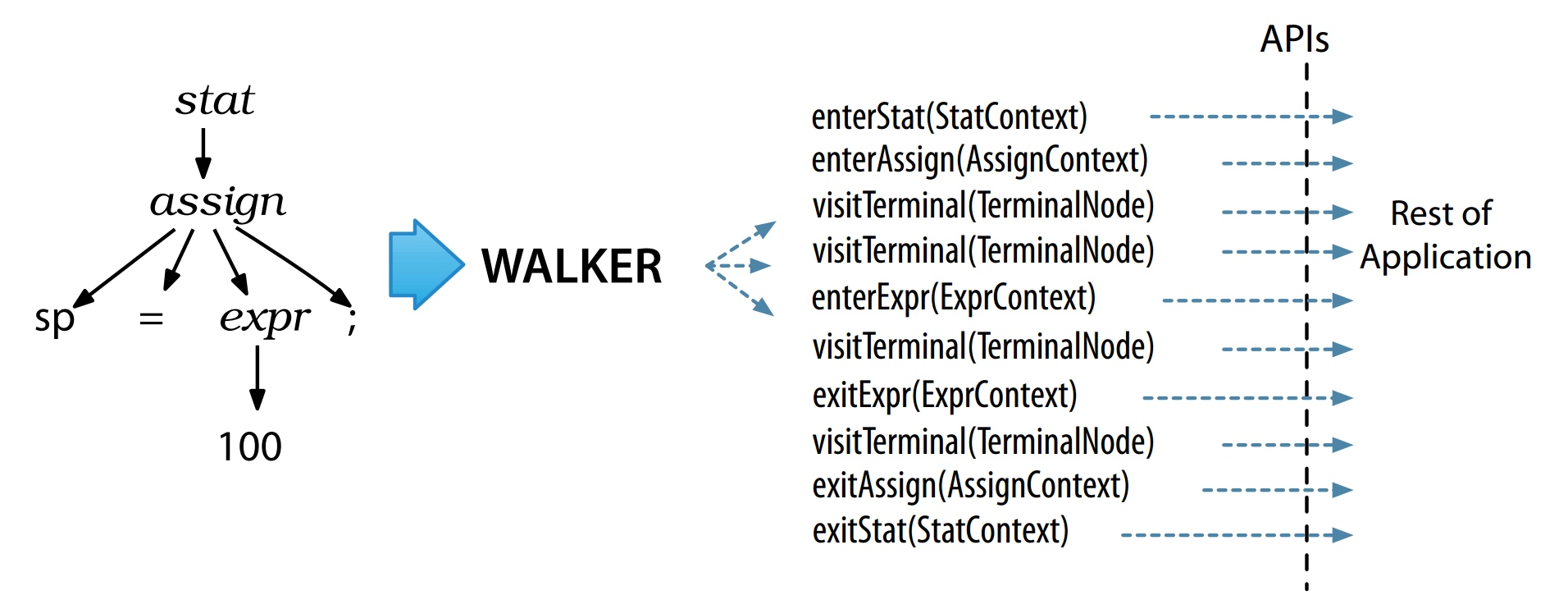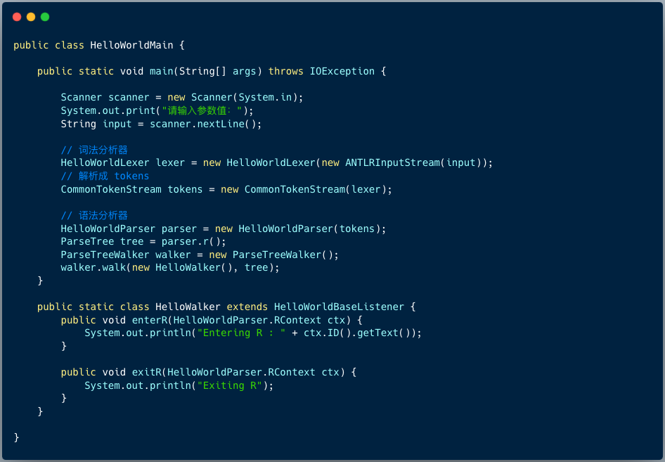 ANTLR 默认为每个语法文件生成了一个 ParseTreeListener 的子类,语法中的每条规则都有对应的 enter 和 exit 方法,用户可以自行实现 ParseTreeListener 接口,来实现自己的业务逻辑。