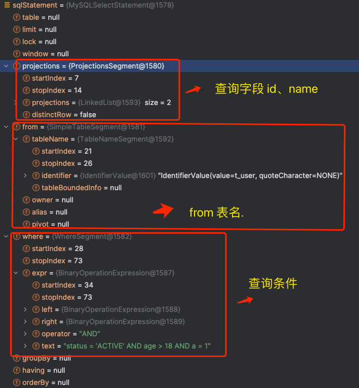 1 | String sql = "SELECT id, name FROM t_user WHERE status = 'ACTIVE' AND age > 18 AND a = 1"; |