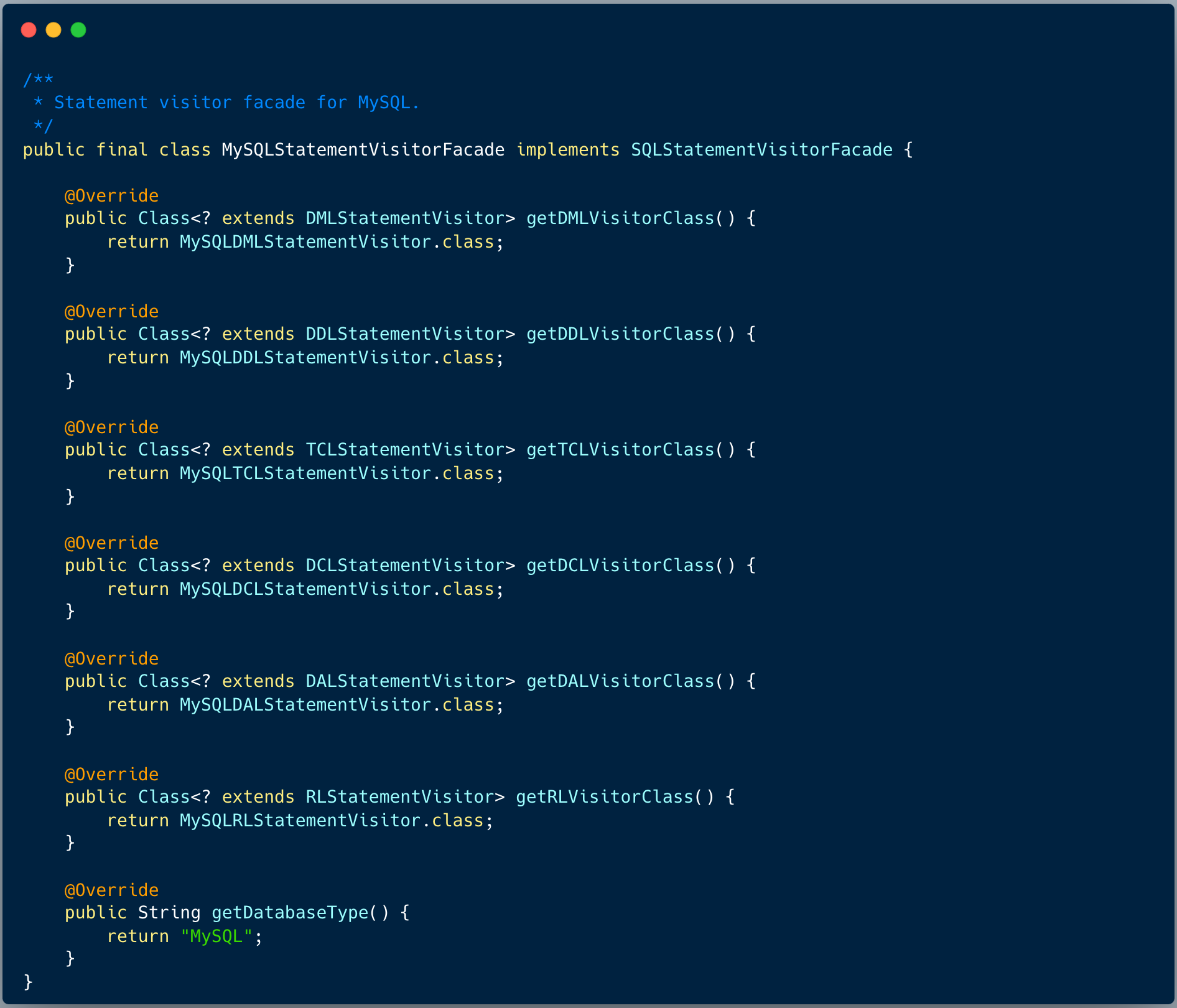 MySQLStatementVisitorFacade 是外观模式,将 MySQLStatement 的访问器都封装起来 。