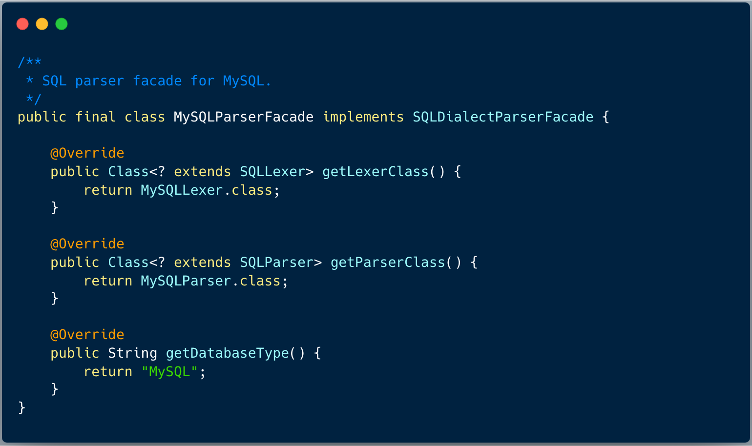 当我们指定数据库方言是 MySQL 时,实际上指向的是:MySQLParserFacade 。