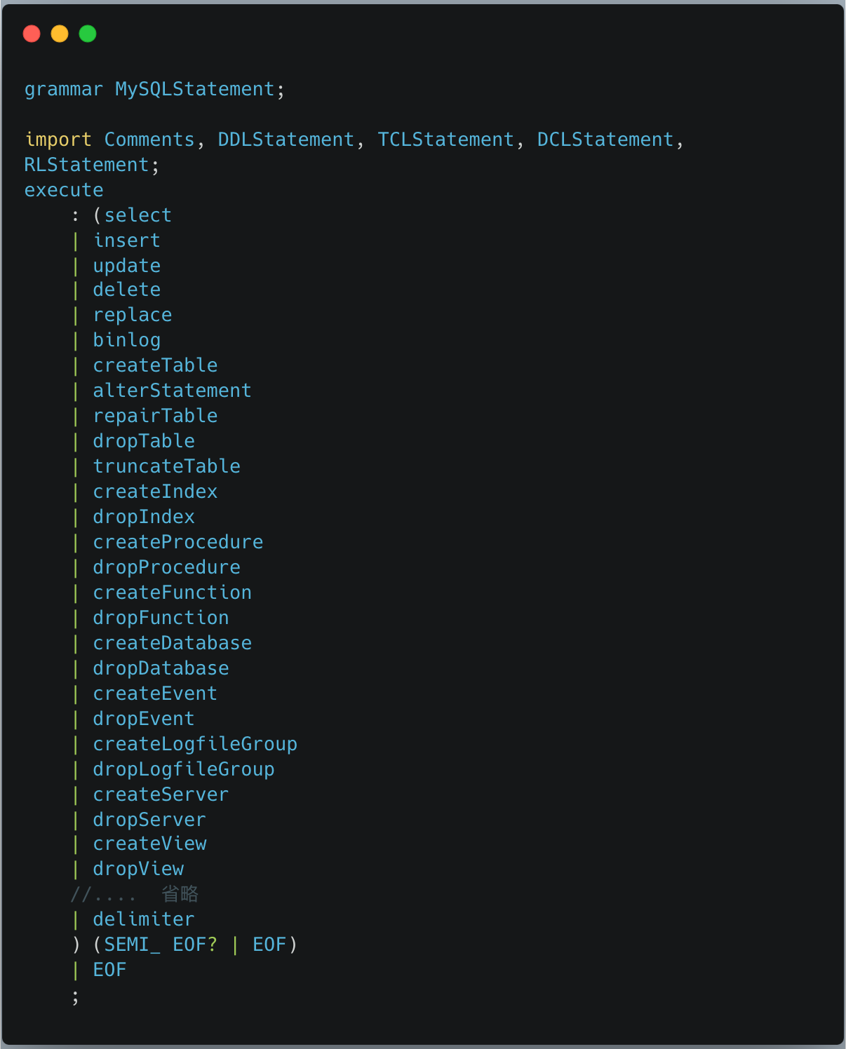 - MySQLKeyword.g4:定义了 MySQL 特有的关键字规则。