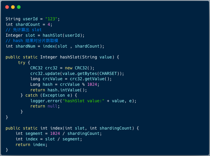 首先将 [0-1023] 平均分为4个区段:[0-255],[256-511],[512-767],[768-1023],然后对字符串(或子串,由用户自定义)做 hash, hash 结果对 1024 取模,最终得出的结果 slot 落入哪个区段,便路由到哪个分库。