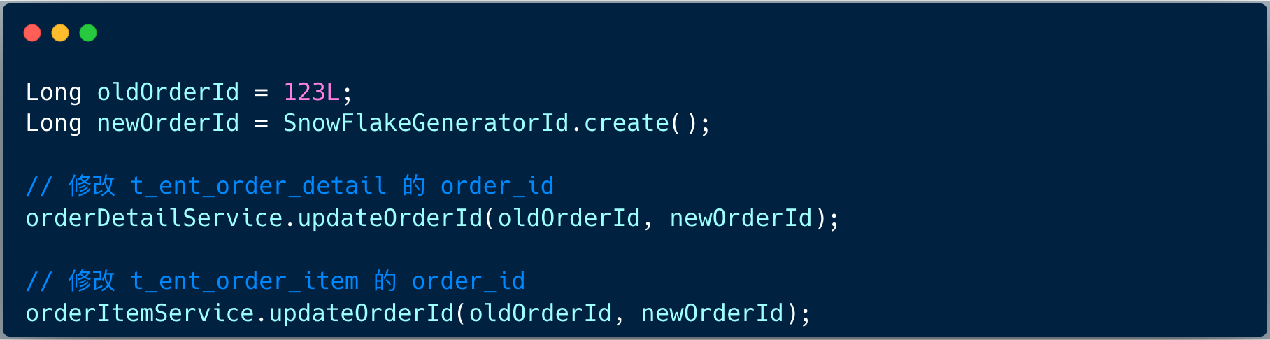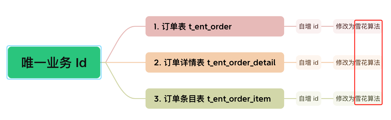 订单相关表都是使用自增 id ,那么我们需要先梳理订单业务逻辑,将订单 id 的生成规则修改成雪花算法模式 ,同时修改详情表、条目表的外键 order_id 修改 。