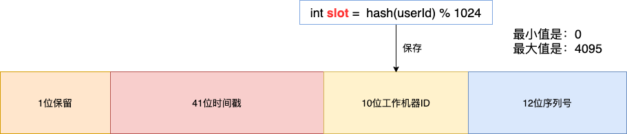 将用户生成的哈希值对 1024 取余,得到的值,我们称之为:slot ,将 slot 保存到 10 位工作机器 ID 里 ,这样每个用户生成的订单 ID 都是唯一的,而且这个订单 ID 可以反推出 slot 值 。