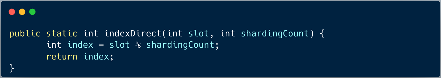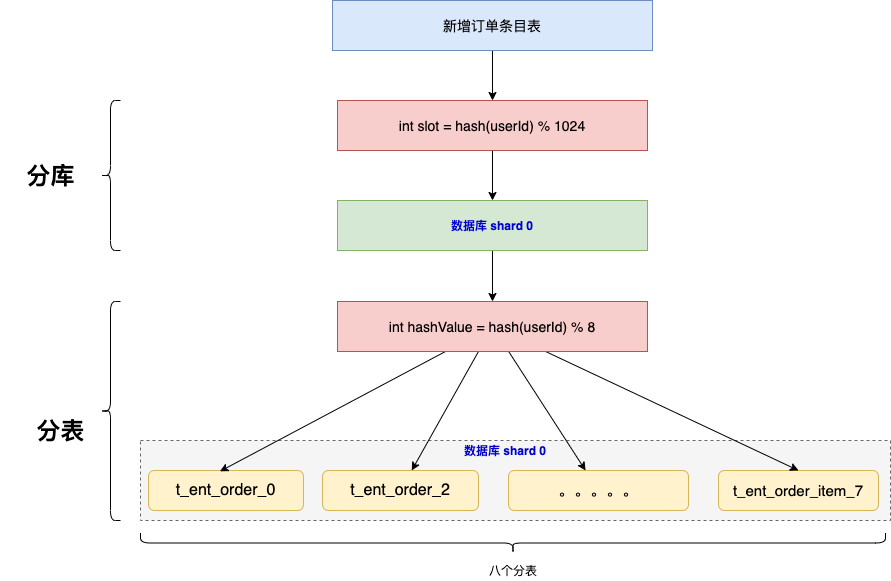 新增订单条目表时,首先根据分库算法定位到数据库分片之后,然后根据最简单的取余算法,因为有八个分表,通过 slot % 8 得到分表的索引。