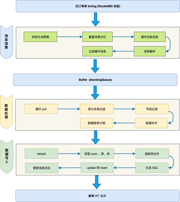 然后再开始历史数据全量同步,当历史全量数据同步完成后,在开启消费 RocketMQ 消息进行增量数据同步(提高全量同步效率减少积压也是关键的一环),这样来保证迁移数据过程中的数据一致。