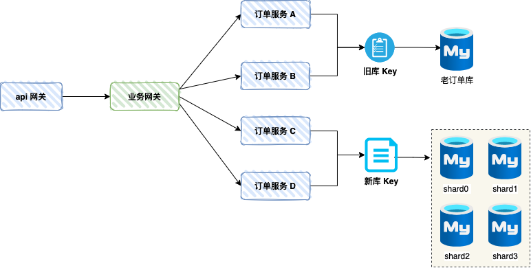 此时订单库没有做任何分库分表,仅仅是单数据库模式,我们需要将单数据库迁移到分库分表的模式。见下图: